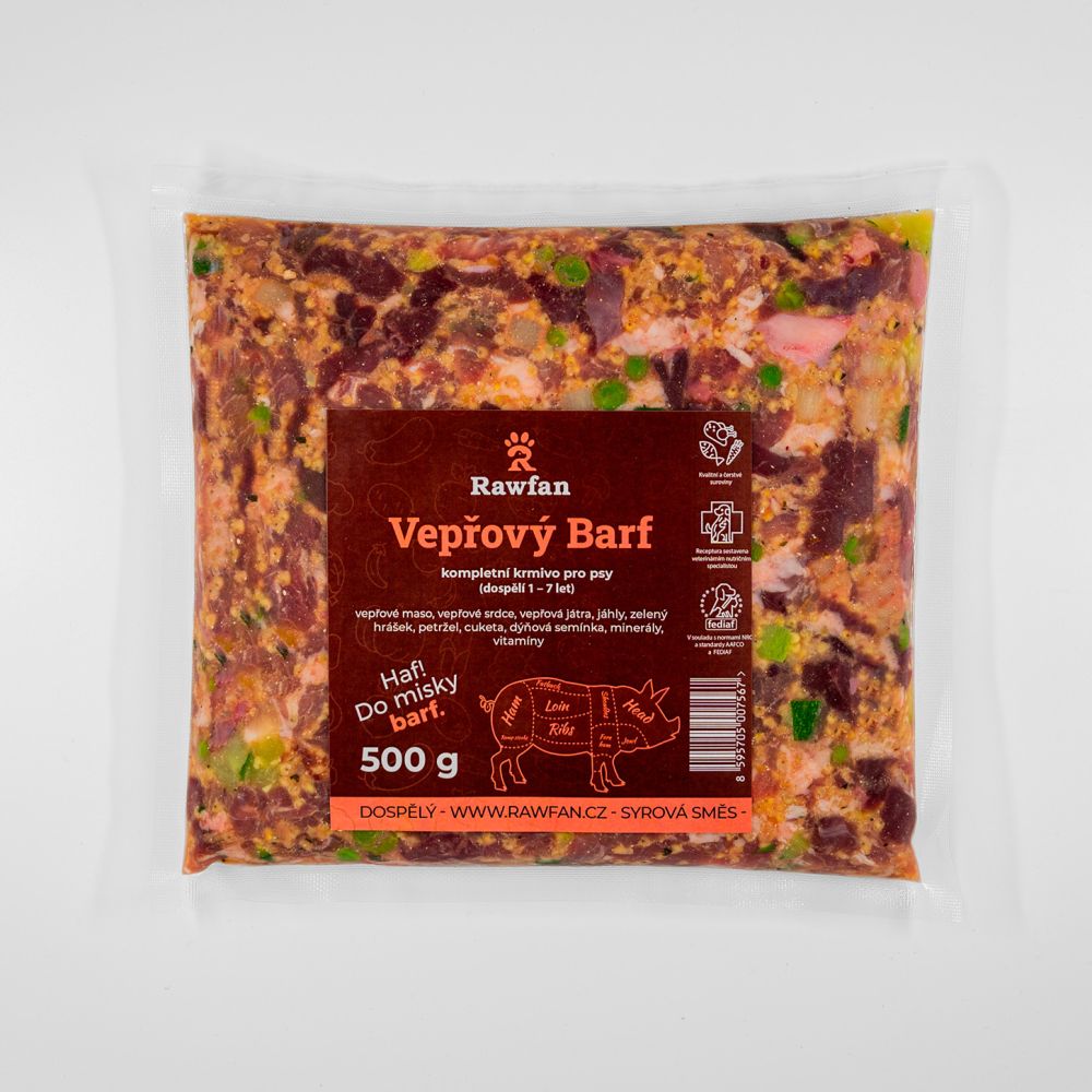 • 1× 500 g VEPŘOVÝ BARF pro dospělé psy – šťavnatá energie pro aktivní chlupáče.