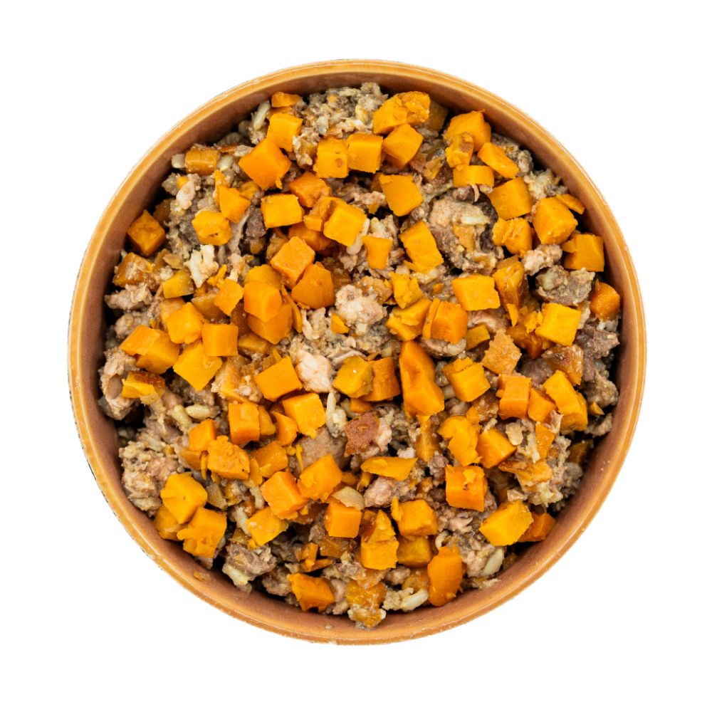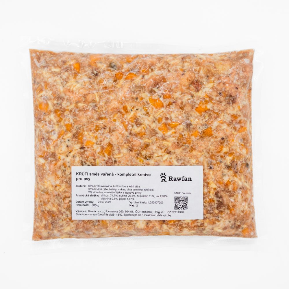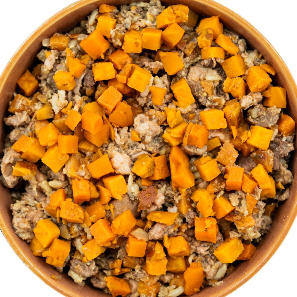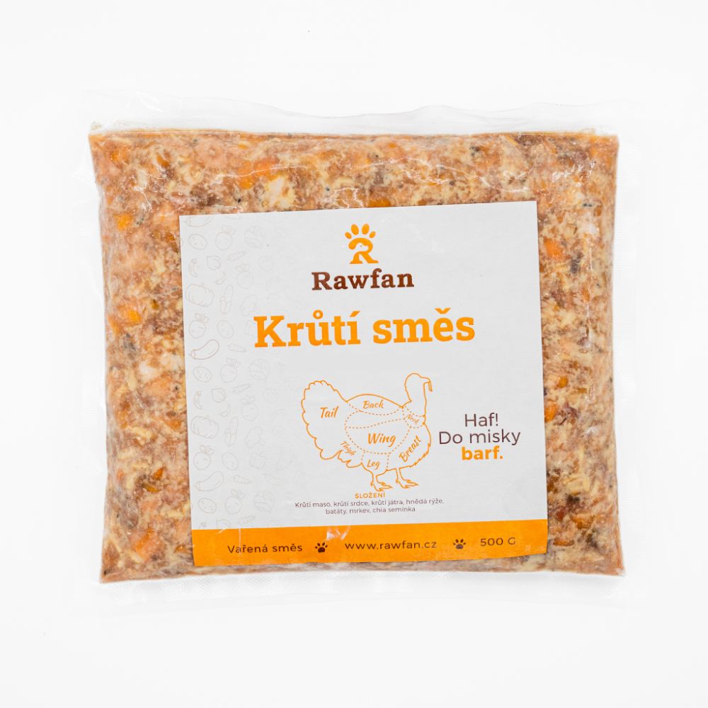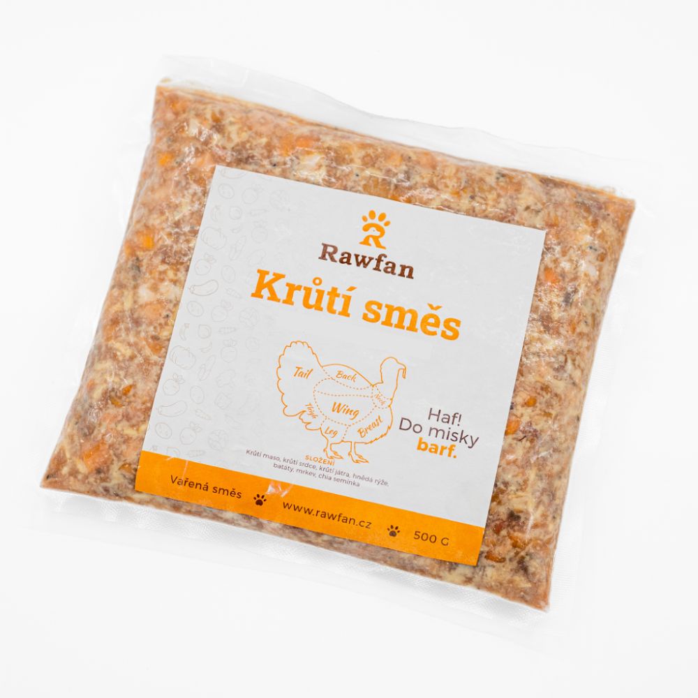 V páře připravovaná kompletní strava pro psy. Krůtí směs je vyrobena z čerstvého krůtího masa, krůtích srdcí a jater, hnědé rýže, batátů, mrkve, chia semínek a lněného oleje, doplněné o potřebné vitamíny a minerální látky.